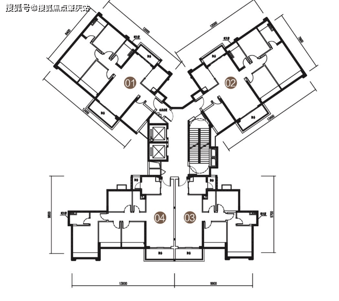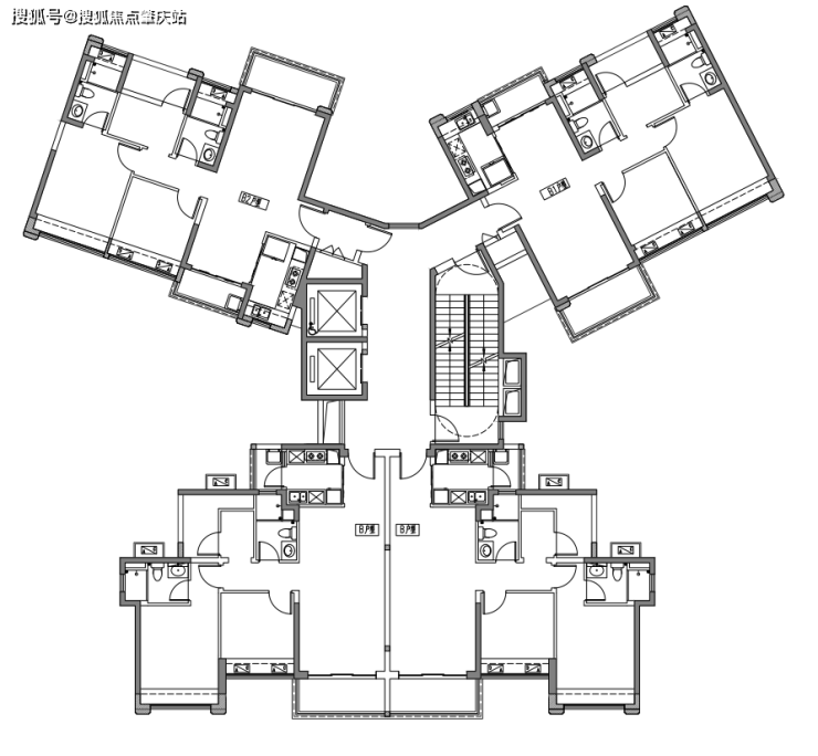 ①2栋楼层平面图:2梯4户,直面中央园林景观