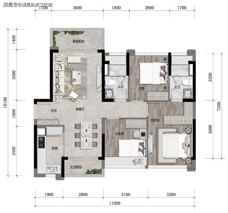 【98平三房两卫】超3.6米开间景观阳台,3面朝南,通风采光优渥,使用率超90%