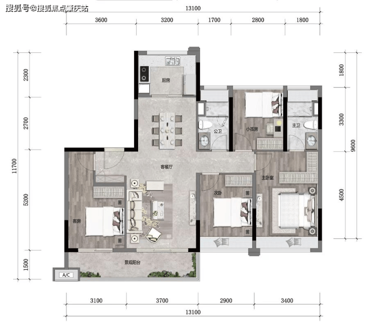 【123㎡四房两厅两卫】明星四房产品,超4米开间景观阳台,约3.2米开间生活阳台,南北对流,通风采光优渥
