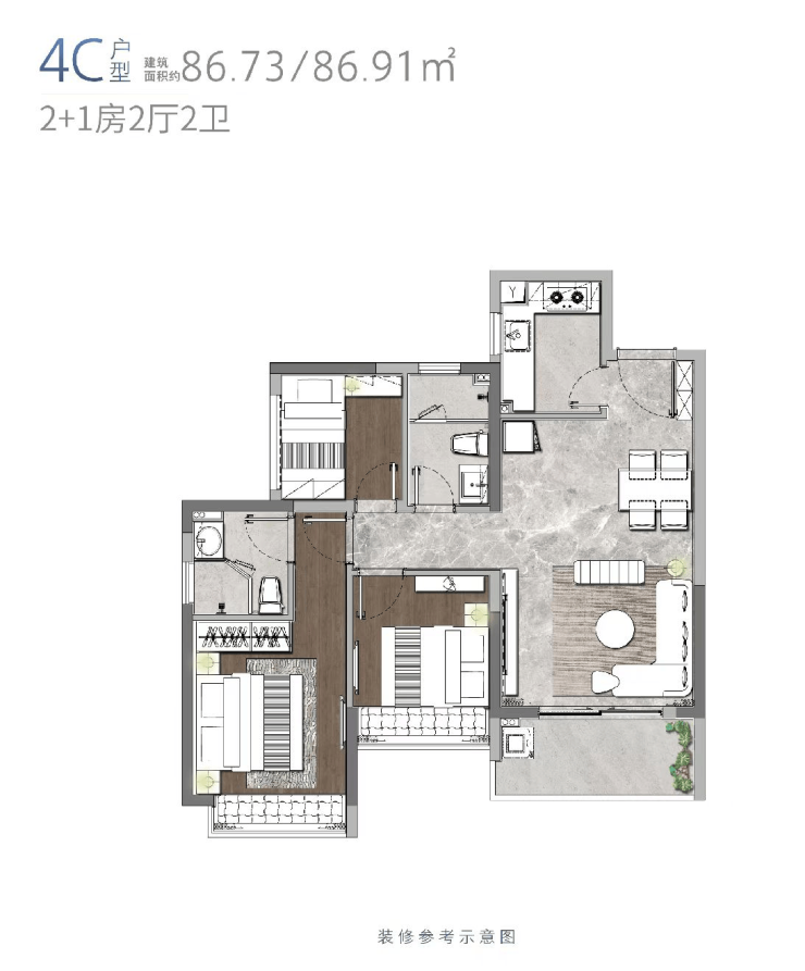 4栋C户型86.73/86.91㎡三房两厅两卫