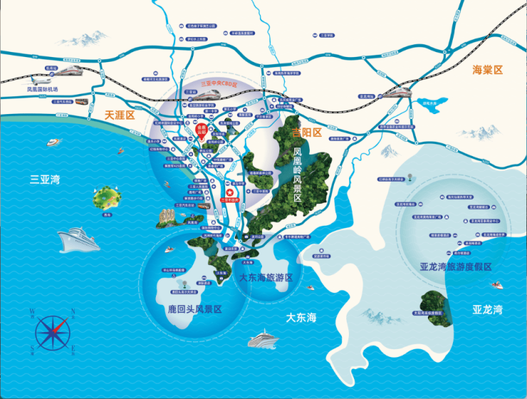 项目近临金鸡岭路、三亚河东路;城市中轴线凤凰路、鹿城大道穿梭而过;城市主干道迎宾路、解放路、落笔洞路、三亚湾路等交通网络;2公里三亚动车站,5公里环岛高速出入口,10公里凤凰机场,城市轻轨及多条公交路线停靠。立体交通网络,出行便捷无忧。