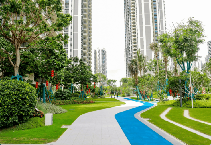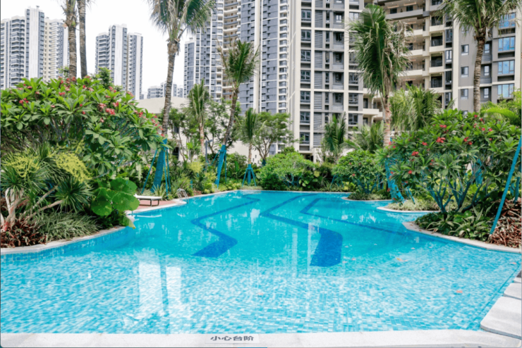 小区园林设计结合海南地域特色,建筑围合成中心花园,设计了泳池、儿童游戏及景观广场,并种植海南本地的乔灌木,配置四季常开的花卉植物的核心绿地作为主景观节点,为居民提供公共活动聚集、休闲、健身娱乐的休闲场所。