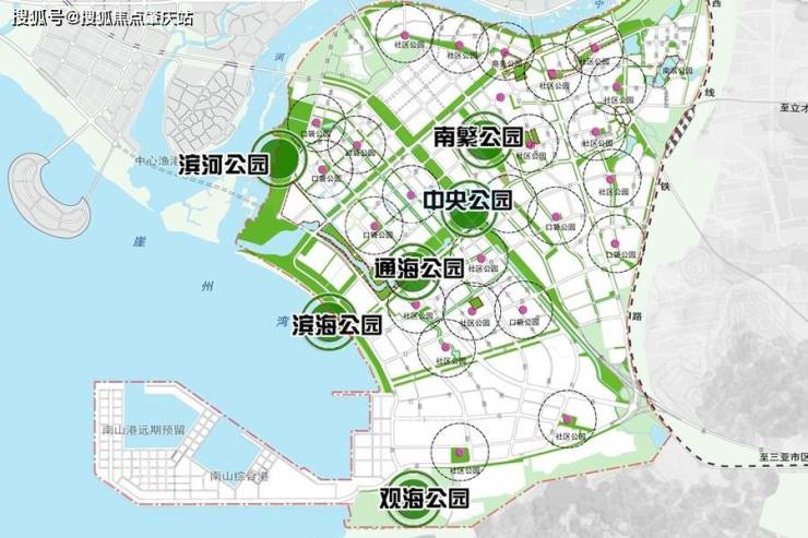 公园配套:通海公园、滨海公园、南繁公园、滨河公园、观海公园;