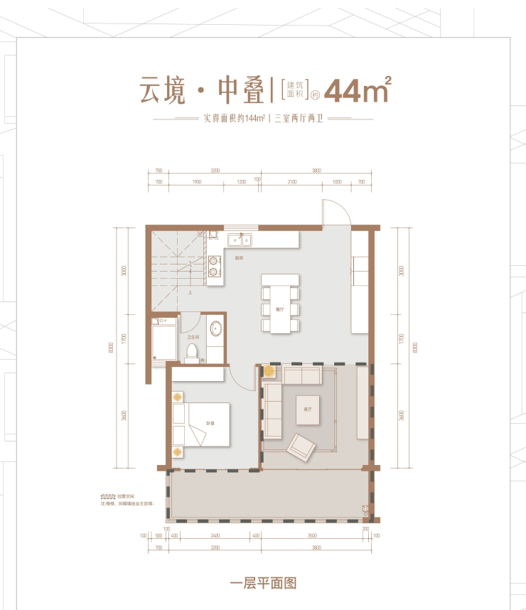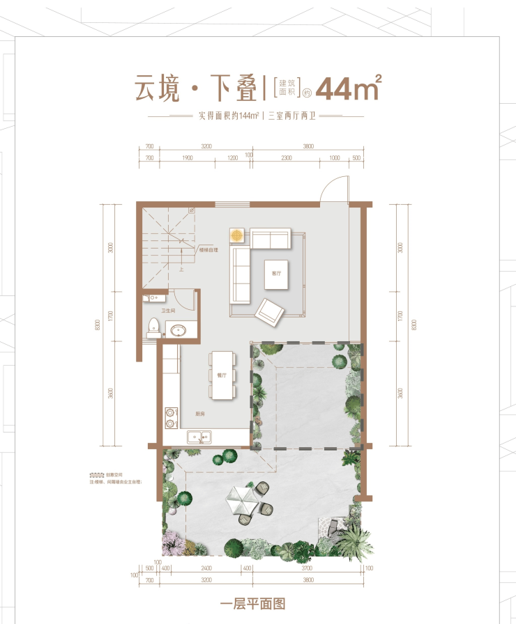 建面约44㎡,实得约144㎡