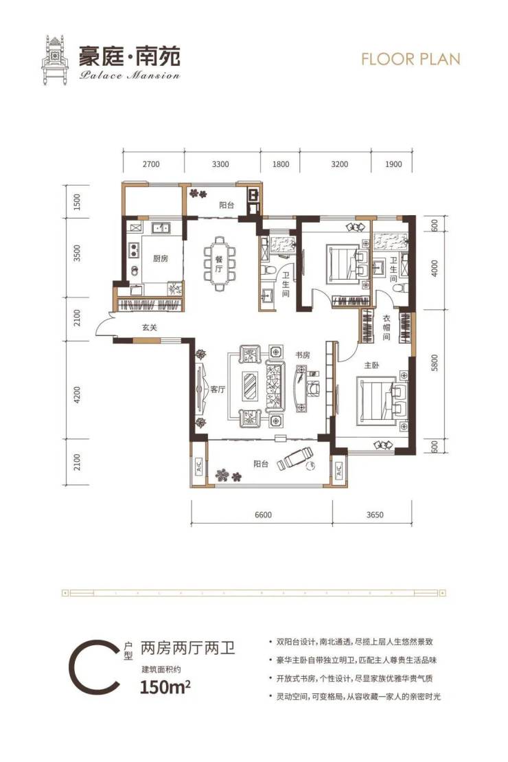 C户型建面约150㎡,双阳台设计,南北通透,主卧享有衣帽间及独立卫生间,6.6米宽的客厅可满足开放式书房设计,尽显书香人家华贵气质,同时6.6米宽景大阳台,享受无线开阔的视野,又可从容收藏一家人的亲密时光。