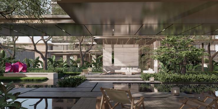 国际化大师景观团队倾力构筑,以“玉”为引,融入“繁花”,更有百年古树点缀,结合海南在地文化,以「六幕十二境」营造奢雅尊崇的礼序归家体验。