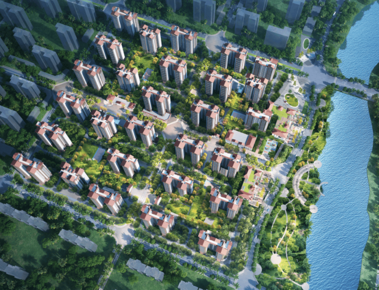 项目的整体鸟瞰图,海棠河位于项目的东侧,是上风上水的风水宝地。