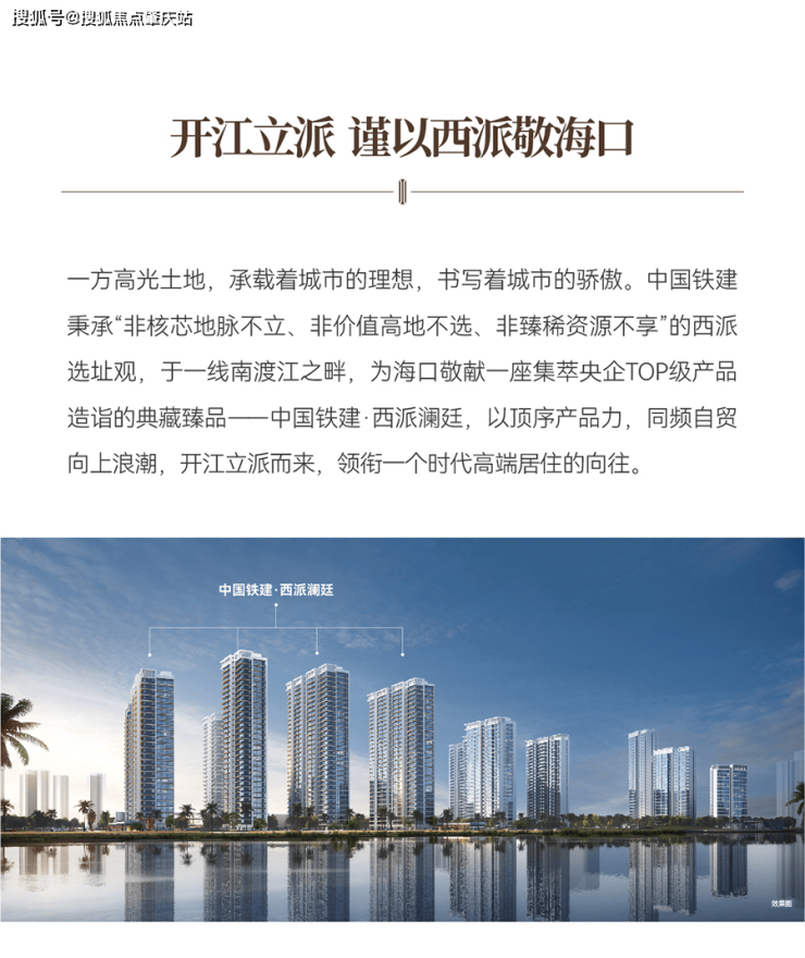 海口中国铁建西派澜廷是中国铁建地产在琼山区打造的一线江景高端住宅,2025 年 7 月首开,主打 108-142㎡精装改善户型,坐拥南渡江景观与滨江新城配套,预计 2027 年 6 月交付。