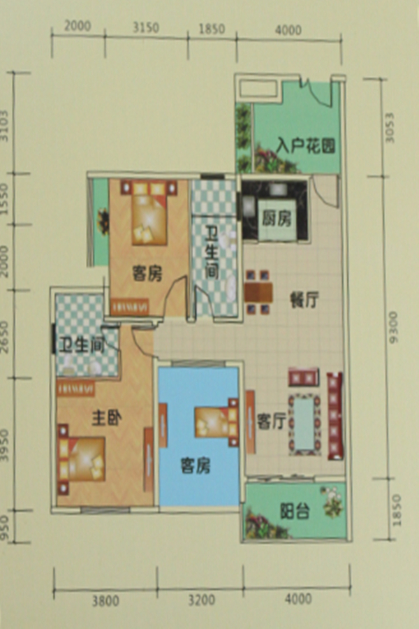 户型带入户花园,双阳台设计,景观视野好,布局合理,整体方正,通风透光性好。主卧不带卫生间,私密性不够好,卫生间门口对着餐厅。
