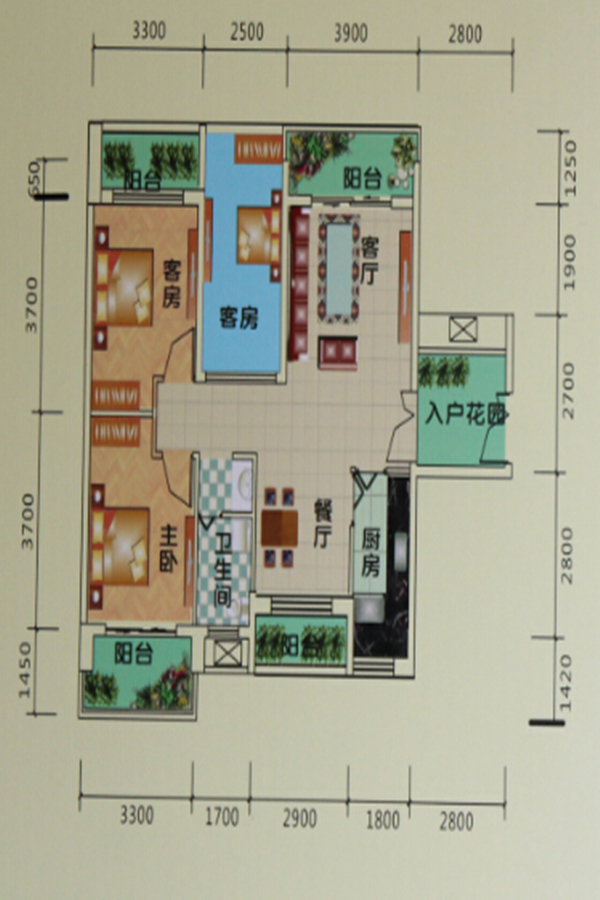 户型带入户花园,大阳台设计,景观视野好,布局合理,整体方正,通风透光性好。主卧带卫生间,私密性较好,但不足之处是卧室门对着客厅。